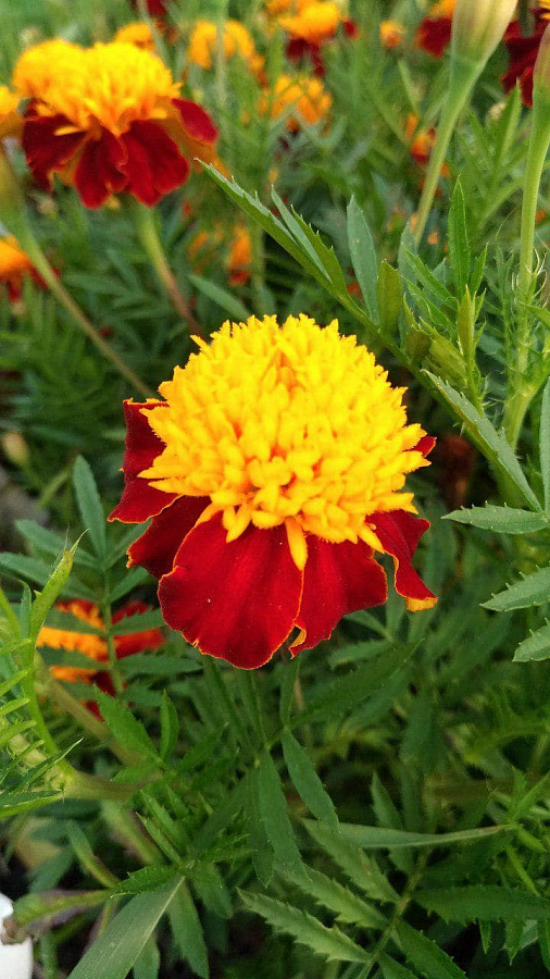 Семена бархатцев «Золотая головка» высевают в почву на солнечные участки во второй половине мая. Состав почвы подходит любой. Между рассадой бархатцев «Золотая головка» придерживаются расстояния в 25 см. Взрослые растения получаются компактными. Их высота редко достигает более 20 см. Период цветения начинается в июне и длится до середины осени. По внешнему виду цветочки напоминают хризантему. Но растение из семян бархатцев «Золотая головка» неприхотливо в уходе. Цветы ярко-желтые в серединке и темно-красные по краям. Станут прекрасным оформлением бордюров и клумб.