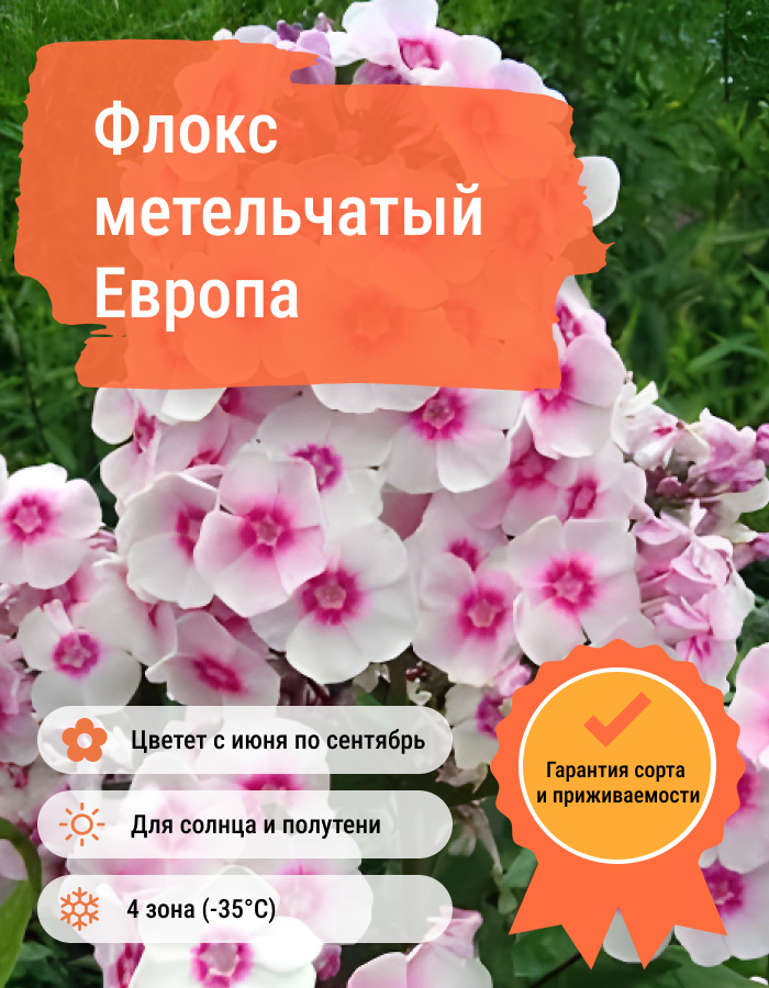 Рассада флокса «Европа» (Europa) подходит для высадки на солнечные и затемненные земляные участки. Через короткий срок растение превратится в небольшой пышный куст высотою от 70 до 90 см. Цветет флокс «Европа» с середины июля и на протяжении месяца. Каждый цветок белого цвета с нежно-розовой серединкой и имеет диаметр около 3,5 см. Несколько цветочков собираются в соцветия диаметром 20 см, благодаря чему на кусте образовываются большие шапки. Декоративное растение устойчиво к непогоде, соцветия не распадаются во время сильных ветров и дождей. Также хорошо переносит зимовку. В период цветения нуждаются в обильном поливе. Семена «Европы» собираются после отцветания цветов.