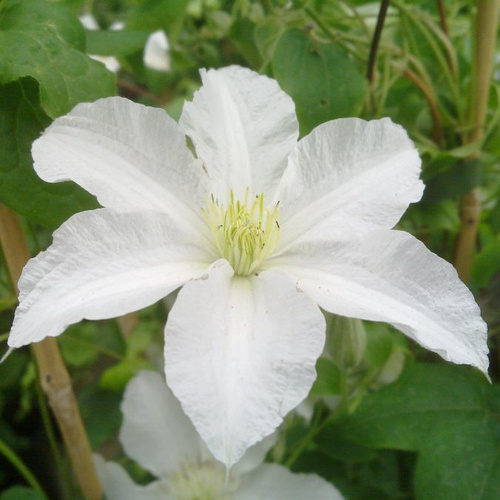 Этот клематис обладает белыми цветками диаметром 8-10 см, которые расцветают во 2, 3 и 4 месяцы. Он предпочитает солнечные и полутенистые места для посадки, а также плодородные почвы. Растение требует умеренного полива и опрыскивания, а также регулярного удобрения для лучшего роста и цветения.