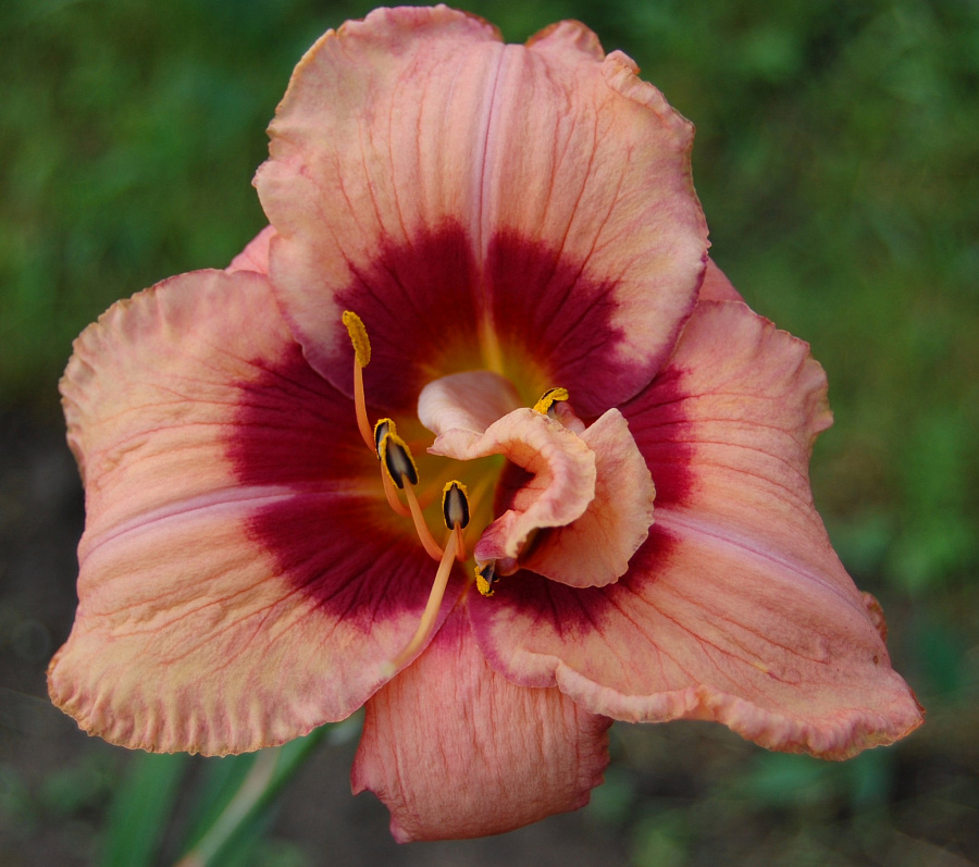 • Окраска цветка : лососевый с пурпурным глазком и зелёным горлом