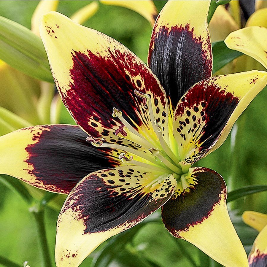 Луковицы Лилии азиатской Танго Изи Данс (Lilium asiatic Easy Dance) ― еще один популярный представитель известной группы «танго», отличающийся интересной расцветкой. Характерное для сорта темное плотное пятно у Изи Данс  насыщенно-фиолетового цвета,  в центре можно видеть незначительный темный крап на желтом фоне. Основной цвет, покрывающий лепестки в их верхней части, светло-желтый.