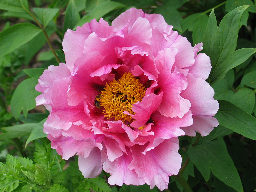 Пион древовидный сияющий букет - это великолепное растение, которое поражает своей красотой и изысканностью. Его ствол устойчивый и прочный, достигает высоты до 200 см, что делает его заметным акцентом в любом саду. Листья пиона древовидного имеют интересную форму и насыщенный зеленый цвет, создавая гармоничный контраст с яркими розовыми цветками размером 20-25 см.