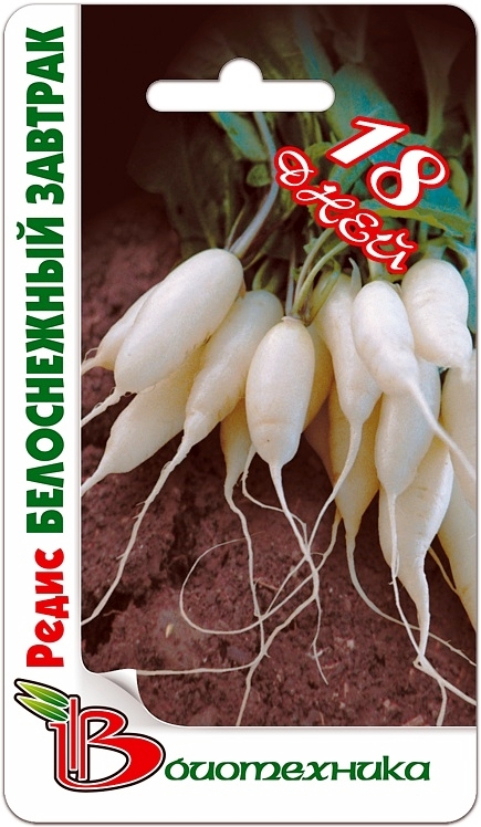Семена редиса "Белоснежный завтрак" (Belosnezhnyj zavtrak) очень быстро прорастают. Собирать корнеплоды можно уже спустя 18-20 дней после появления первых всходов. Урожай отличается удлиненно-цилиндрической формой, но при этом не крупный. Диаметр не превышает 2-4 см. Редис полностью окрашен в белоснежный цвет, очень сочный, обладает великолепными товарными и вкусовыми качествами. Он не одревесневеет и не растрескивается. Сорт подходит для выращивания на протяжении всего лета. Используют урожай, богатый витаминами и минералами, для приготовления различных свежих салатов.
