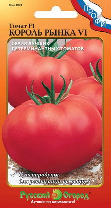 'Семена томата Король рынка VI F1 порадуют любителей овощей, предназначенных для приготовления салатов. Этот сорт можно выращивать на открытых участках огорода, не используя пленку или укрытия из стекла. Масса зрелых плодов достигает 300 грамм. Их сочная мясистая мякоть отличается высокими вкусовыми качествами. Крупные красивые помидоры не растрескиваются при перевозке, что дает возможность продавать продукцию на рынке.