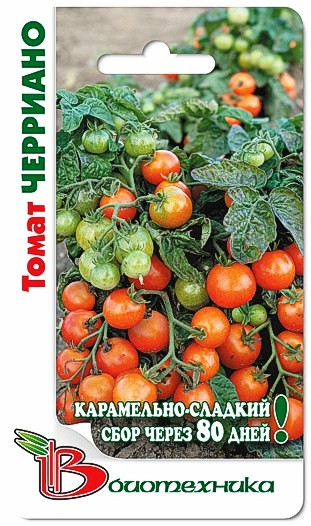 Семена томата "Черриано" (Cherriano) – это сорт маленьких черри. Первые всходы появляются достаточно скоро после посева. Растение небольшое, подходит для выращивания не только на грядках, но и в горшках на подоконнике. Куст очень декоративен. От появление всходов до начала сбора урожая проходит 80-85 дней. Плоды маленькие, отличаются высокими товарными и вкусовыми качествами. Мякоть карамельно-сладкая. Кожица тонкая, плотная, ярко-красная. Средняя масса плодов около 15-20 грамм. Урожай подходит для употребления в свежем виде и цельноплодного консервирования.